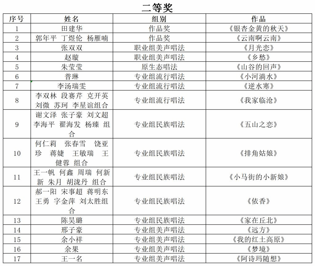 特别贡献奖1个(吴渝林、业原作曲《阿诗玛随想曲》)、作品类一等奖2个、职业组美声唱法一等奖1个、职业组流行唱法一等奖1个、职业组民族唱法一等奖1个、专业组流行唱法一等奖2个、专业组民族唱法一等奖2个、专业组美声唱法一等奖3个、作品类二等奖2个、职业组美声唱法二等奖2个、原生态唱法二等奖1个、专业组流行唱法二等奖3个、专业组民族唱法二等奖5个、专业组美声唱法二等奖4个、作品类三等奖1个、职业组美声唱法三等奖4个、职业组民族唱法三等奖3个、职业组流行唱法三等奖1个、专业组流行唱法三等奖2个、专业组民族唱法三等奖4个、专业组美声唱法三等奖5个、作品类优秀奖3个、职业组民族唱法优秀奖4个、职业组美声唱法优秀奖14个、专业组流行唱法优秀奖1个、专业组民族唱法优秀奖11个、专业组美声唱法优秀奖6个、原生态唱法优秀奖1个。