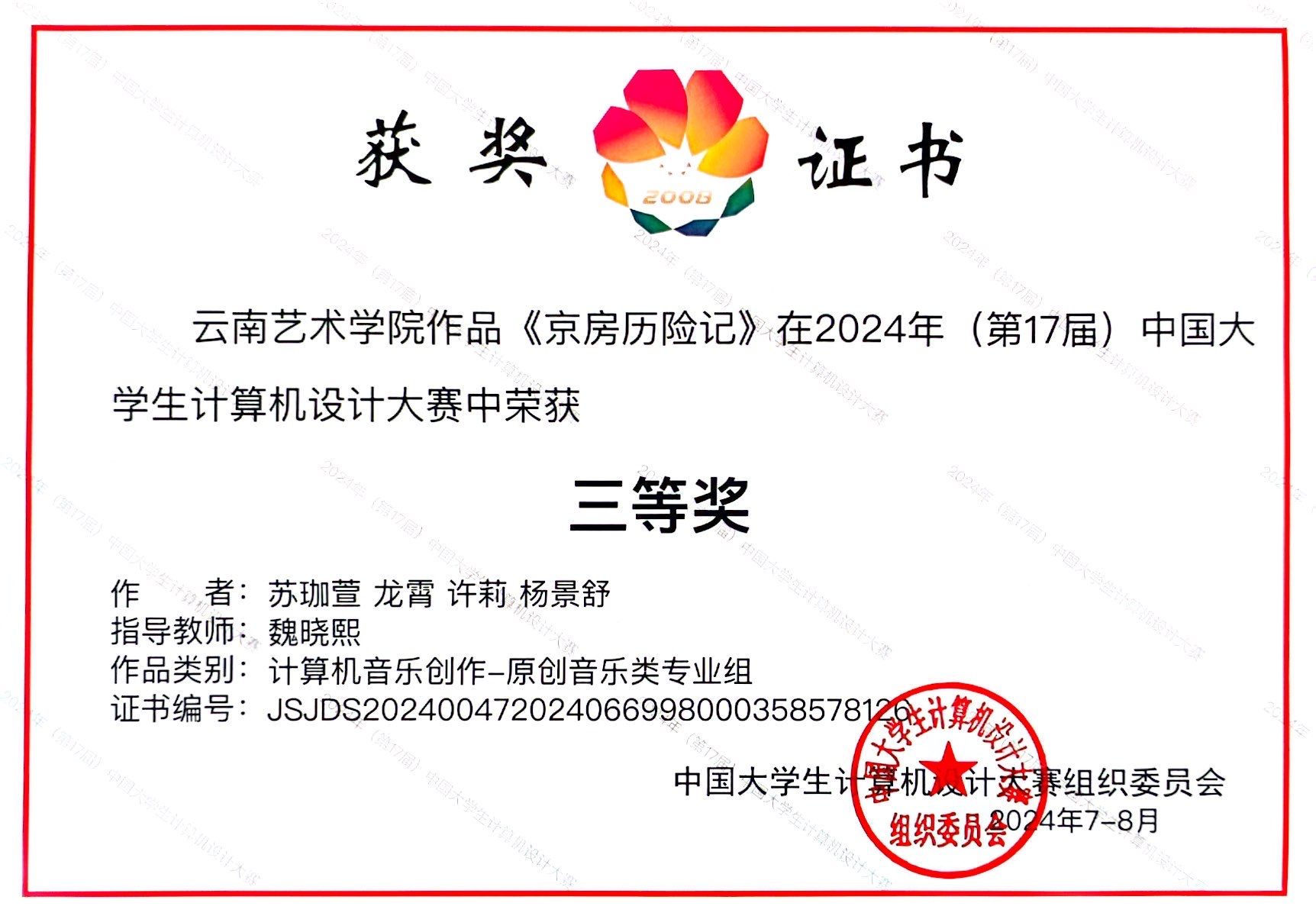 2024年(第17届)中国老员工计算机设计大赛决赛于8月18日开幕、8月21日落幕,该赛事汇集了全国各大高校的精英学子,其中计算机音乐创作组有全国各大高校共106件作品进入决赛。yl6809永利作曲系教师指导的两部作品以云南省一等奖的成绩进入全国总决赛,两部作品均荣获计算机音乐创作-原创音乐类专业组三等奖。