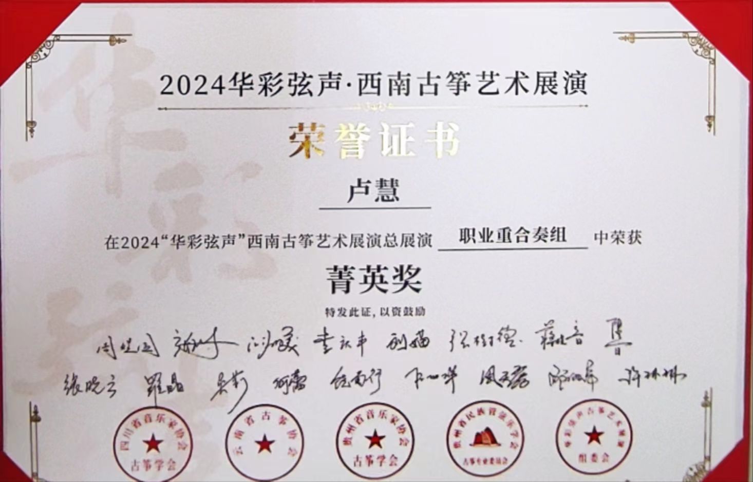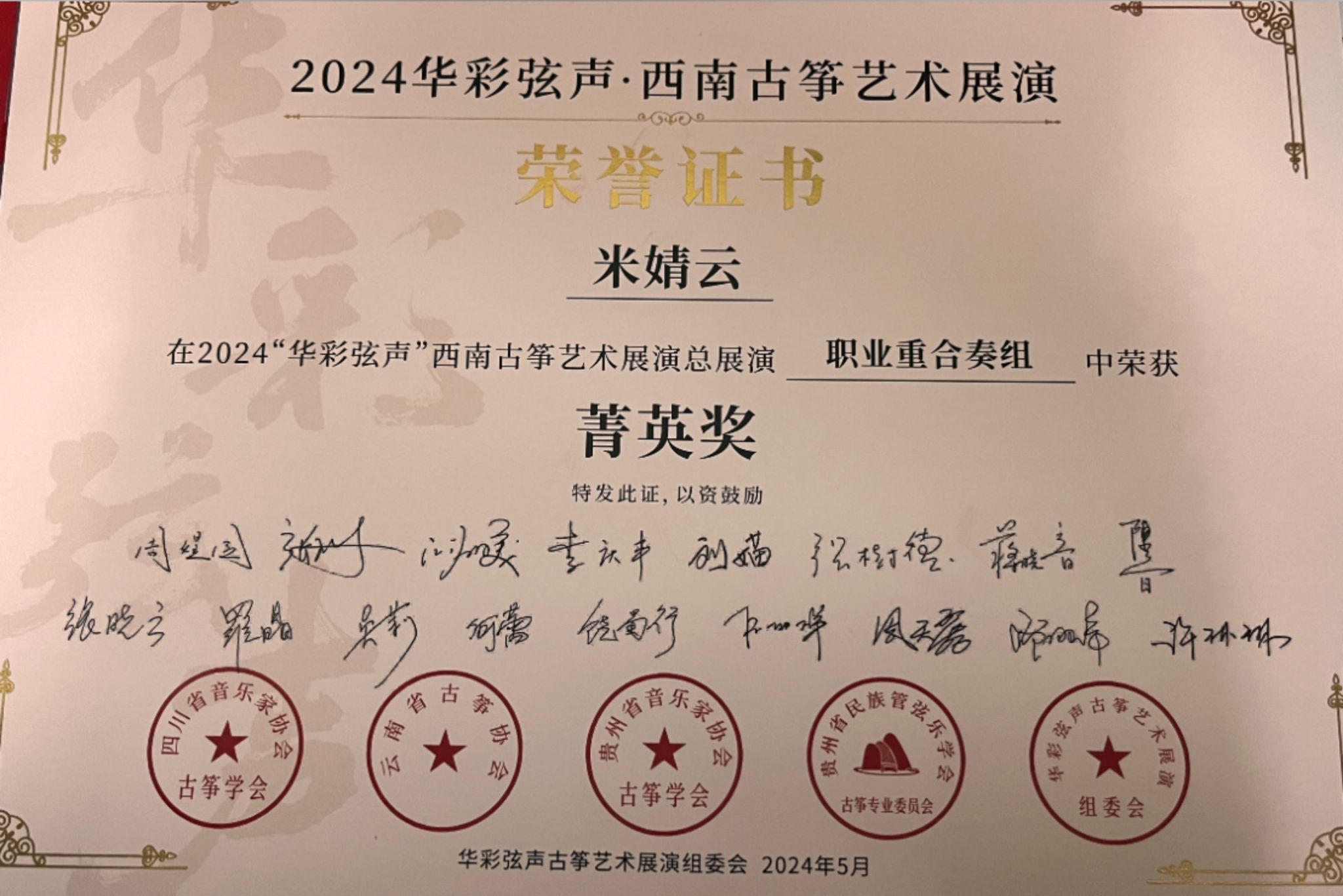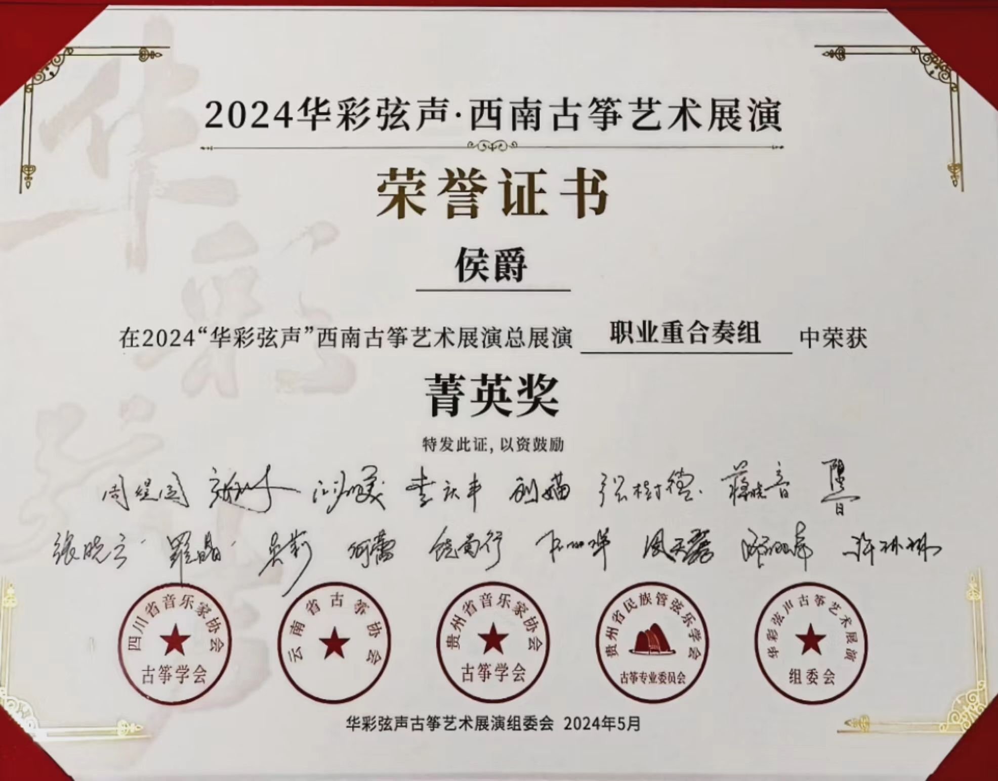 2024年5月1日至5日,由四川省音乐家协会指导,四川省音乐家协会古筝学会、云南省古筝协会、贵州民族管弦乐学会古筝专业委员会、贵州省音乐家协会古筝学会主办的“华彩弦声”第一届西南云贵川渝古筝艺术展演在四川公司举行。yl6809永利国乐系教师林恬、陈珂井指导的2023级员工侯爵、卢慧、米婧云荣获职业重合奏组菁英奖。