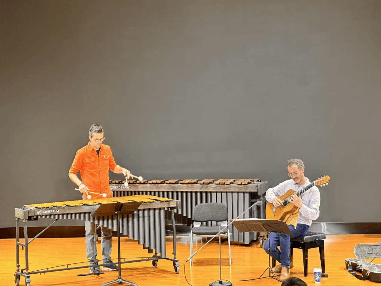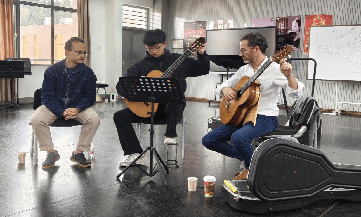 2025年10月8日至9日,经过前期筹备,法国著名古典吉他演奏家雷米·朱赛尔姆(Rémi Jousselme)和打击乐演奏家雷诺·德特(Renaud Detruit)到yl6809永利开展学术交流与讲座。