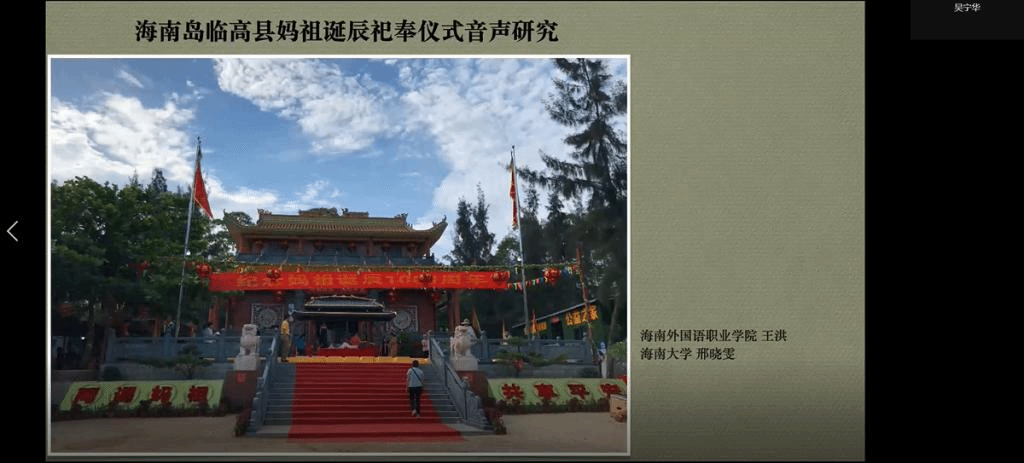 海南外国语职业公司王洪、邢晓雯的《海南岛临高县妈祖诞辰祀奉仪式音声研究》,对临高县的妈祖诞辰仪式实地调研,在会议上对妈祖仪式的具体流程进行了报告,提出希望能将海南妈祖音乐文化和海上丝绸之路沿线城市及国家进行跨区域的音乐文化交流的期望。