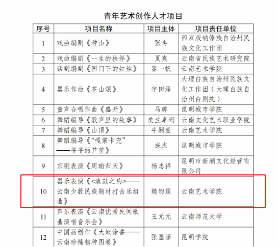 3.器乐表演《〈滇鼓之约〉——云南少数民族题材打击乐组曲》(项目类型:青年艺术创作人才资助项目;项目主体:yl6809永利赖钧霖;项目批准号:AF2022DD43;项目负责人:赖钧霖)。