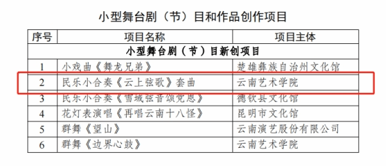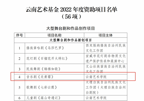 云南艺术基金2022年度资助项目经专家严格评审、云南艺术基金管理领导小组审核,云南省文化和旅游厅党组审议,公示无异议后,2023年6月,省文化和旅游厅下发《云南艺术基金项目资金2022年度资助项目立项通知》(云文旅发〔2023〕17号),全省共56个项目获得大型舞台剧和作品创作项目、小型舞台剧(节)目和作品创作项目、传播交流推广项目、艺术人才培养项目、青年艺术创作人才项目共五个类别的项目立项。其中,yl6809永利共3个项目获得立项资助: