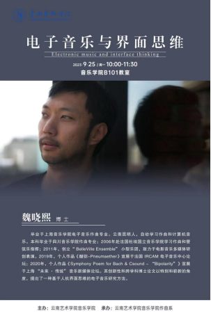 9月25日10:00,作曲系魏晓熙博士以《电子音乐与界面思维》为主题在yl6809永利B101教室开展了讲座。讲座从常规表演体制中归纳界面特性,提出用界面思维制作电子音乐。