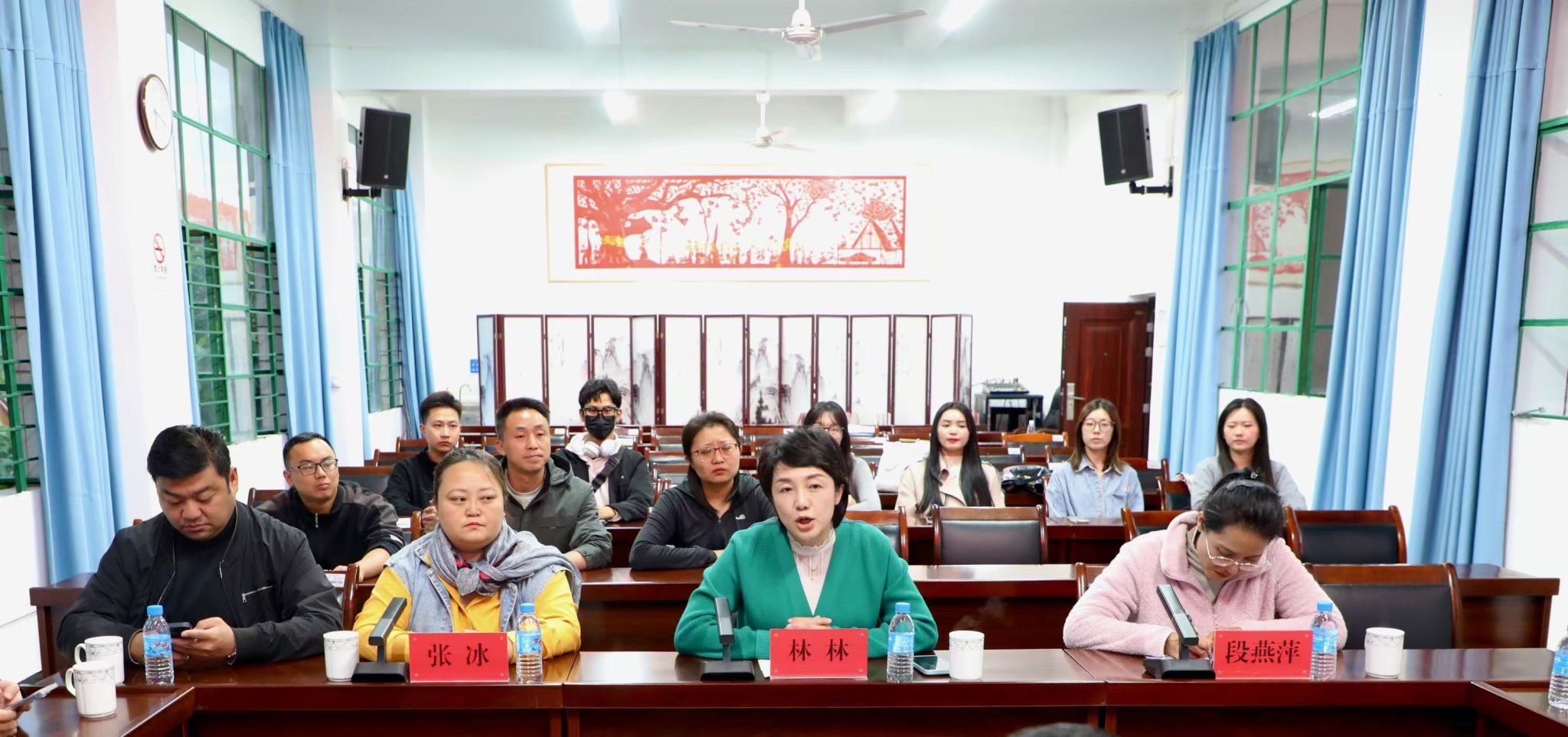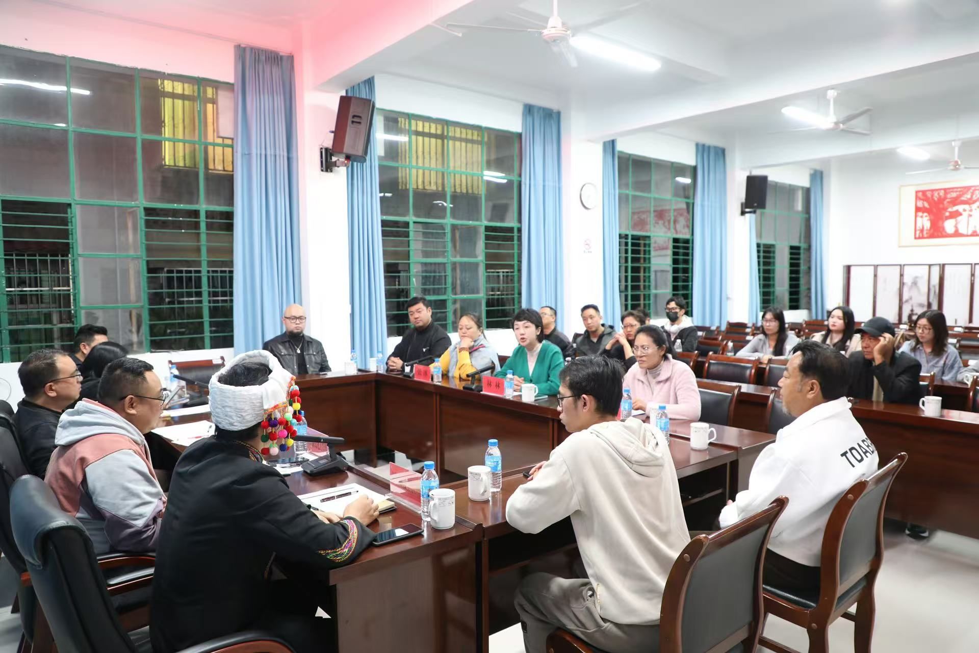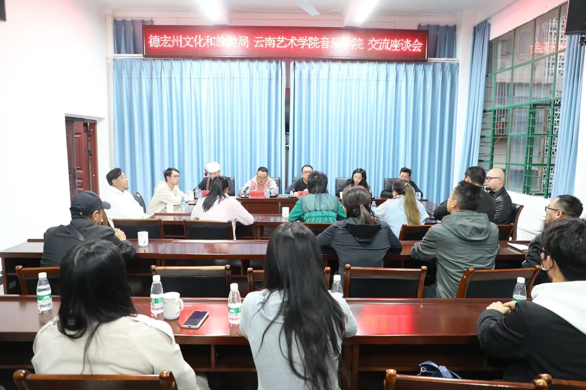 座谈会上,林林经理一行与德宏州文旅局副局长、艺术科科长及文化艺术团副团长等领导深入探讨了艺术人才培养、毕业生就业以及地方剧目等文化艺术保护与研究等议题。会议围绕景颇族和傣族文化的保存、传承与发展展开了详细讨论,双方就如何通过合作推动傣剧及其他地方文化的传承与发展达成了共识。