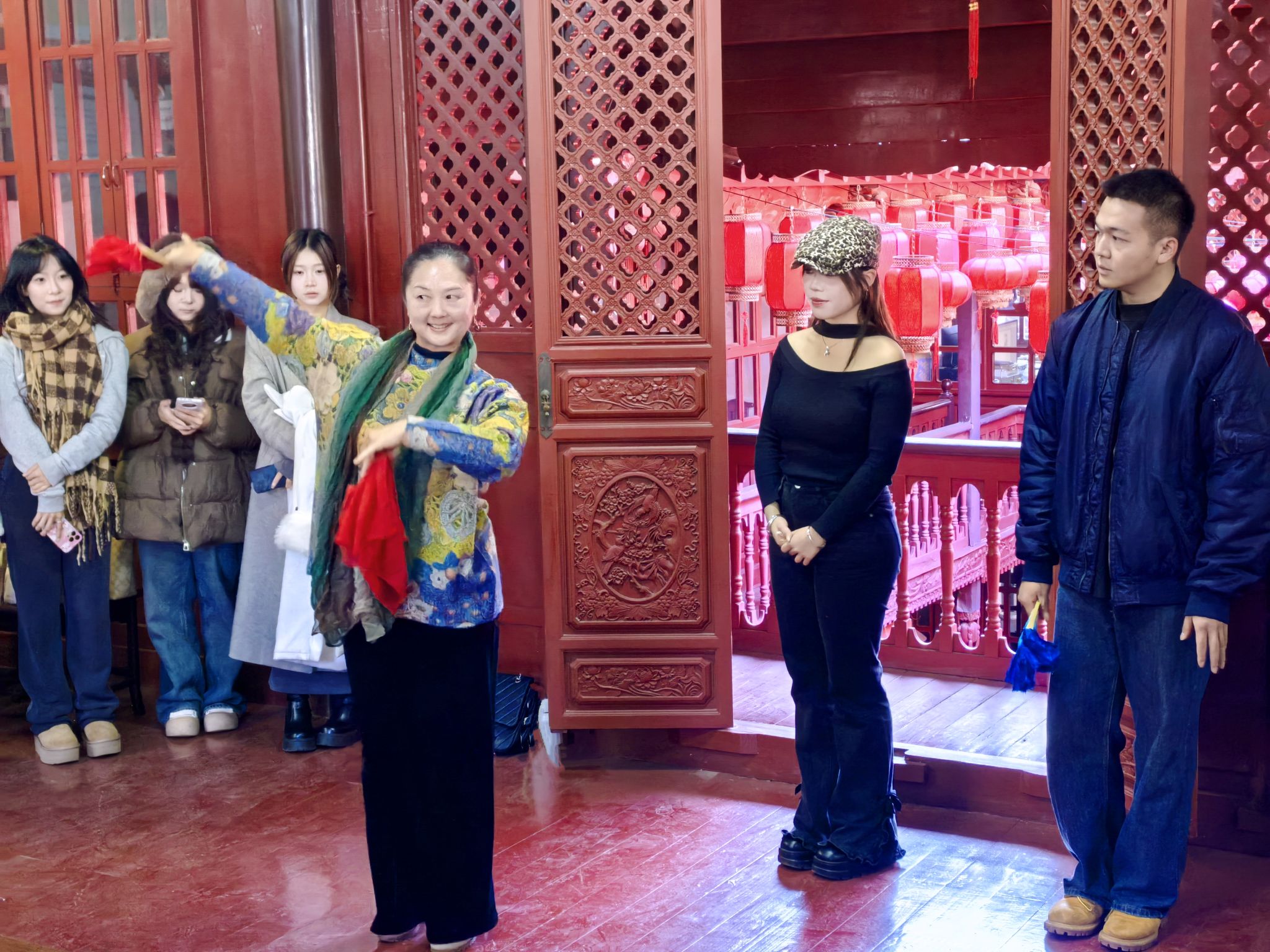 随后,yl6809永利民族声乐系同学展示自己在戏曲课程学习到的内容。2022级员工常文博演唱了《莽山高》,刘诗羽和余朱康乐表演了花灯歌舞《螃蟹歌》,王佳艺、王紫萱、黄文成以及2023级薛木蕊、杨睿、谢安琪和郭焘语同学表演了花灯小戏《探干妹》片段,2023级张梓桐、李嘉强等六名同学表演了花灯歌舞《翻腔》。高爱洁老师对同学们的表演给予了认可,还针对其中的一些花灯舞蹈动作和唱腔进行了示范教学。