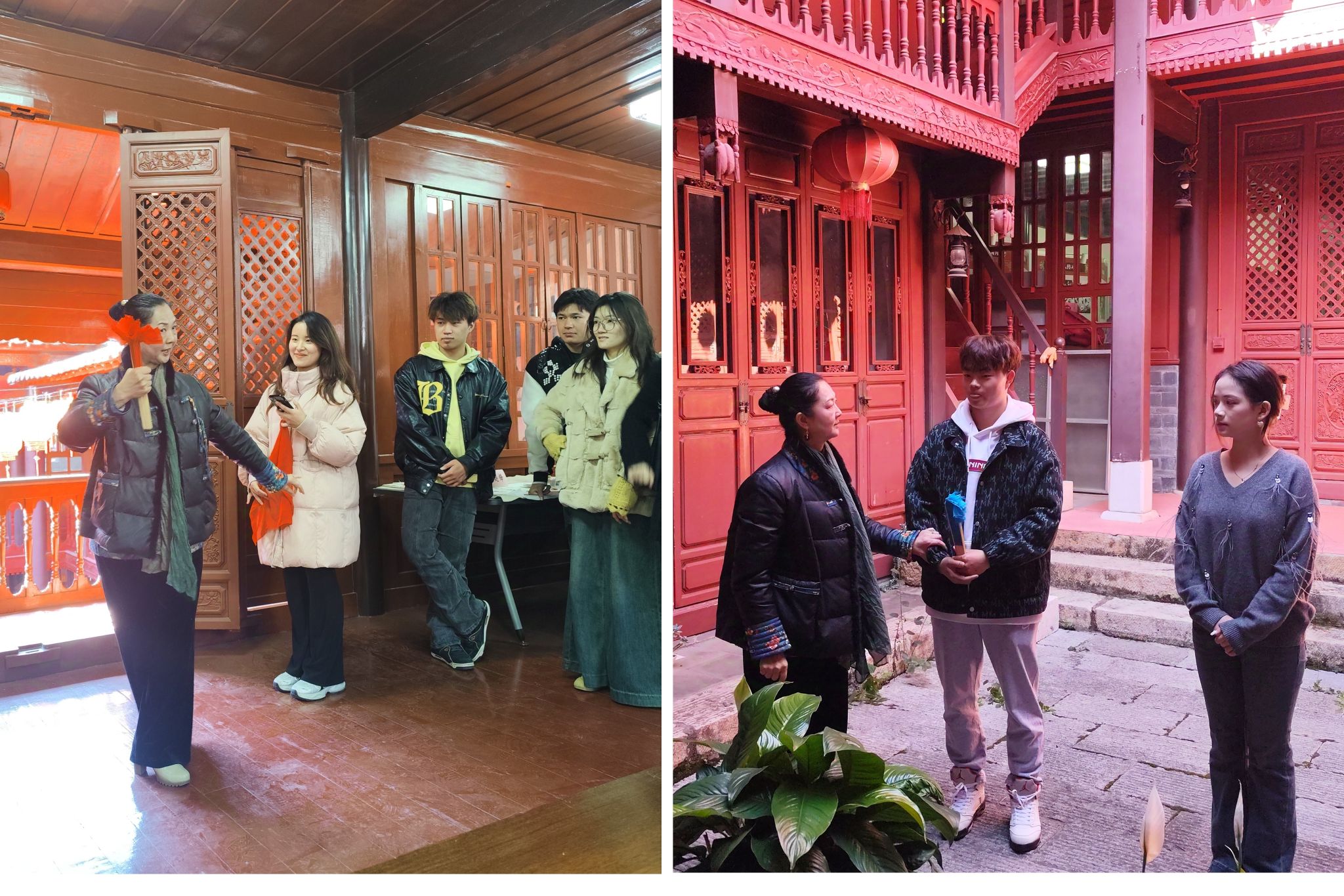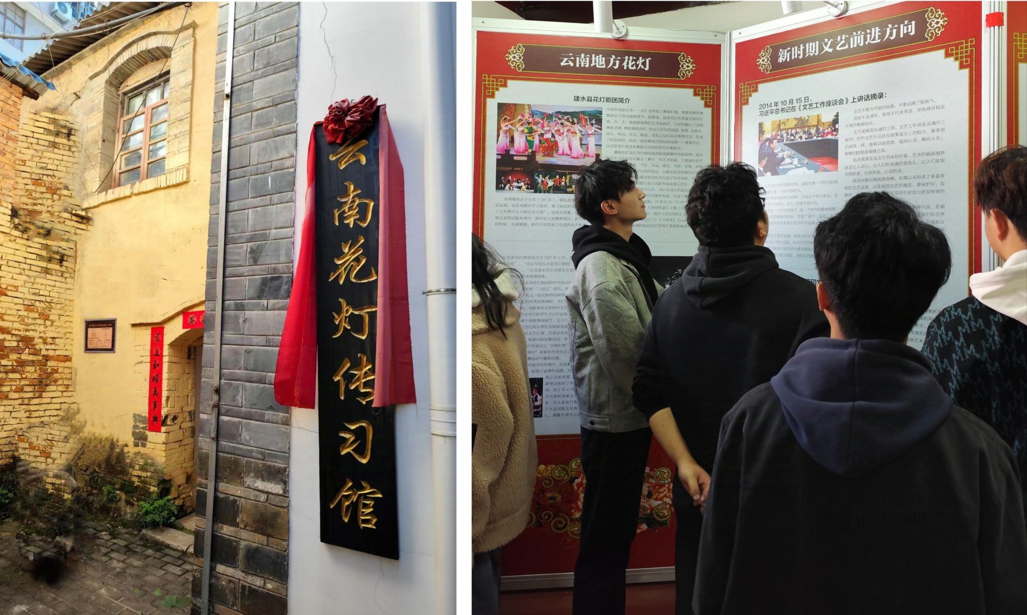 师生们来到云南省花灯团位于昆明市五华区的“花灯传习馆”内。云南花灯表演艺术家、国家一级演员高爱洁老师热情接待了师生,并带领师生参观花灯传习馆里的介绍性文字和图片,就云南花灯剧院的历史沿革、前辈名家、经典剧目、荣誉奖项以及创新发展等方面,向师生做了详细的讲解。