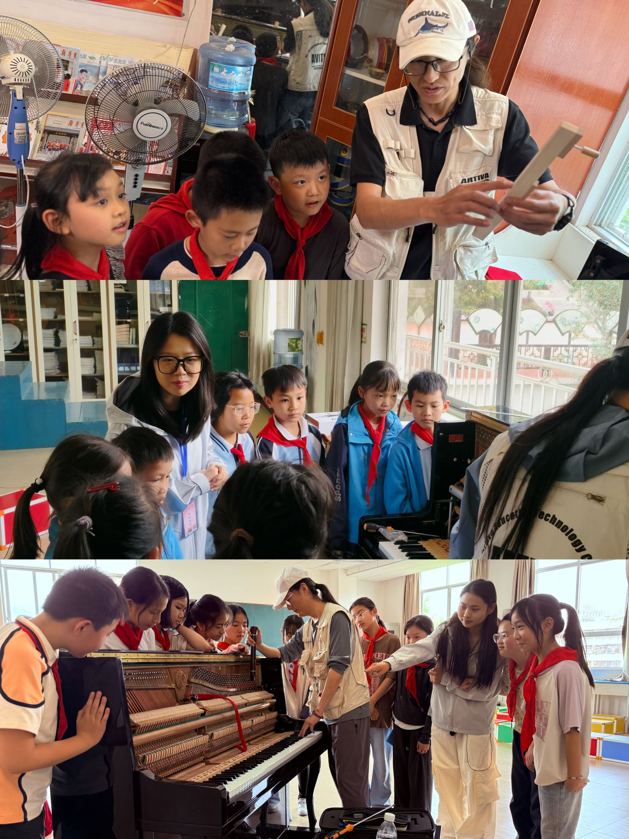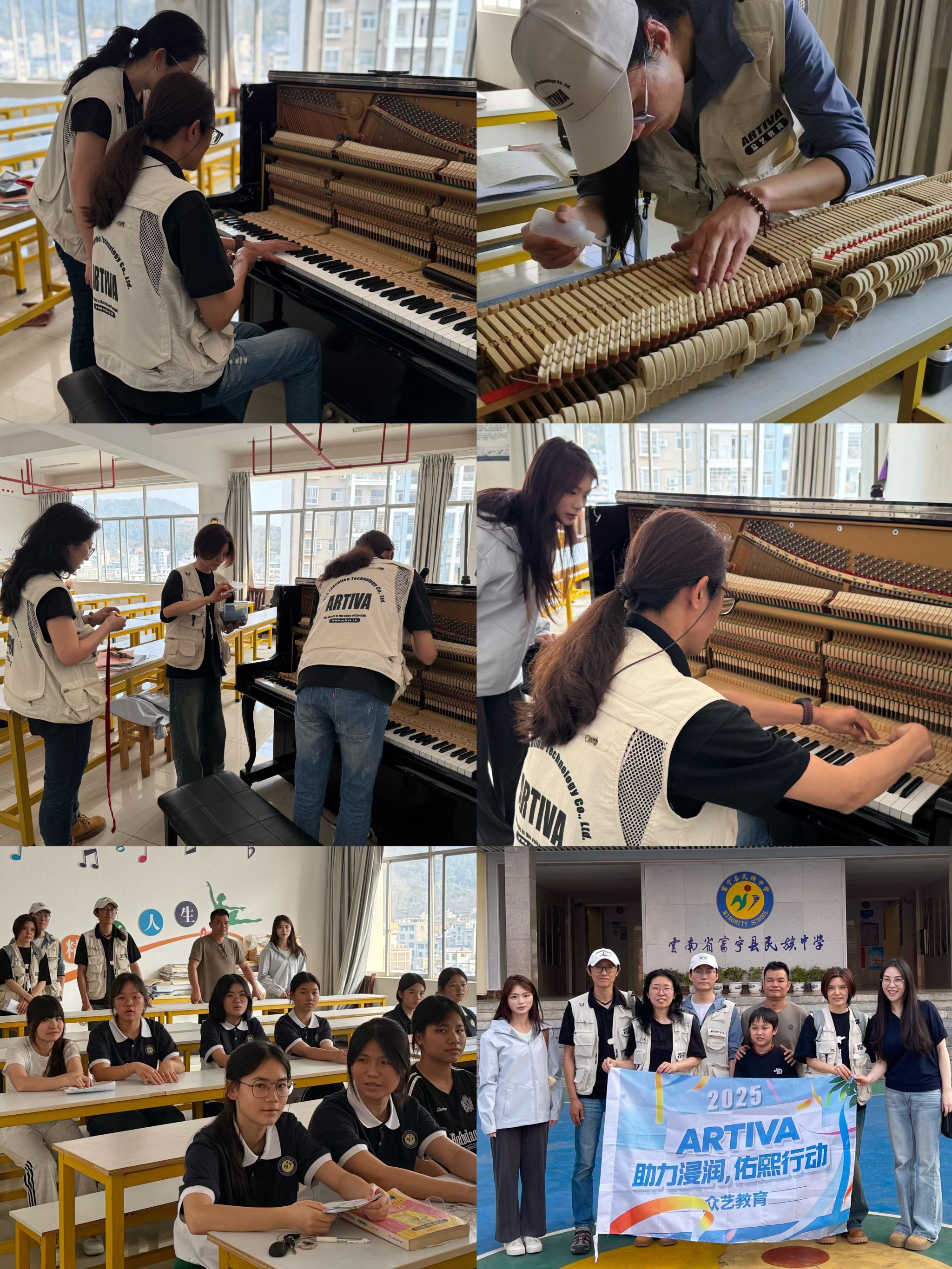 yl6809永利第四批驻点师生积极协助协调,确保工作顺利推进。随后,团队成员迅速展开工作,在一周内高质量完成了7所公司24台钢琴的调律与维修任务,余下的48台钢琴预计将在一个月内全部完成。在开展钢琴调律工作的同时,团队成员还向当地师生传授钢琴维护知识和常见故障处理方法,激发员工对乐器的兴趣,提升员工的美育素养。