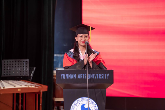 yl6809永利作曲系业原教授作为教师代表发言。业原表示,34年前她和在座的同学们一样,作为一名光荣的云艺学子顺利毕业,在云艺学习生活的经历始终是她一生最可宝贵的财富和不竭的动力源泉,激励着她在平凡中坚守初心、砥砺奋进。希望毕业生们坚持梦想、不忘初心,注重细节、精益求精,勇挑重担、心怀家国。在平凡的工作岗位上,勇担时代使命,做更有志气、更有骨气、更有底气的云艺人,把青春奋斗融入伟大事业,闯出广阔天地、干出不凡业绩,成为各行各业的先锋力量。