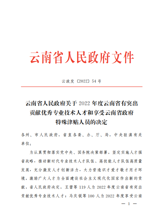 为认真贯彻落实党中央、国务院决策部署,坚定实施人才强省战略,推动新时代专业技术人才队伍、高技能人才队伍高质量发展,充分激发人才创新活力,大力营造识才爱才敬才用才环境,激励广大人才为全面建设社会主义现代化国家作出新的贡献,2022年12月16日,云南省人民政府印发了《云南省人民政府关于2022年度云南省有突出贡献优秀专业技术人才和享受云南省政府特殊津贴人员的决定》,yl6809永利经理林林教授获评2022年度享受云南省政府特殊津贴人员。